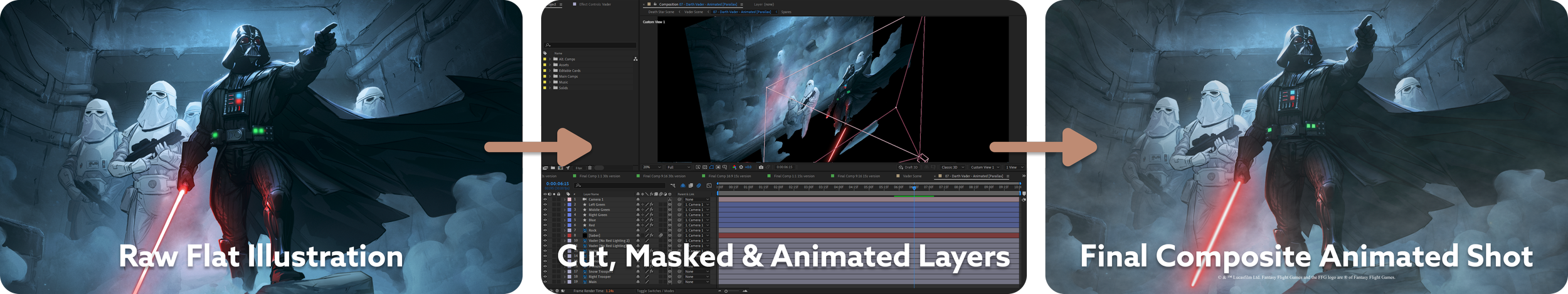 I worked with Lucasfilm, Fantasy Flight Games and Asmodee Group over the course of several months going back and forth with several storyboards and renders to create this epic, atmospheric teaser trailer for the new Star Wars card game: Star Wars Unlimited; later going on to create re-formats for other social platforms and localisations for 9 other regions. Illustrations provided by Fantasy Flight Games.